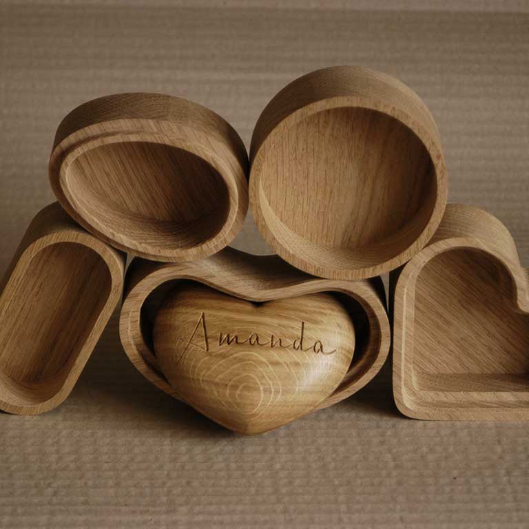 Select from our range of beautiful wooden boxes, hearts, and ring dishes.